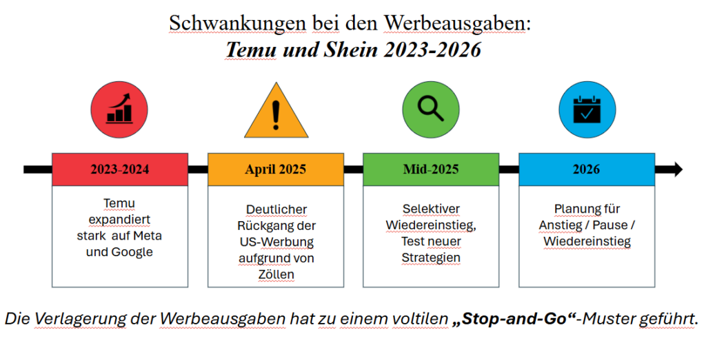 Entscheidend war, dass dies nicht nach einem dauerhaften Rückzug aus den Performance-Kanälen aussah. Vielmehr deutete es auf die Bereitschaft hin, die Ausgaben je nach Konjunkturlage zu erhöhen oder zu senken, wodurch ein wiederkehrendes Muster aus Aufschwüngen, Pausen und Wiedereinstiegen entstand, auf das andere Werbetreibende nun in ihrer Planung Rücksicht nehmen müssen. Diese Interpretation steht auch im Einklang mit allgemeineren Berichten, wonach Temu und Shein ihre Werbeausgaben in den USA angesichts des zunehmenden Handelsdrucks erheblich gekürzt haben.