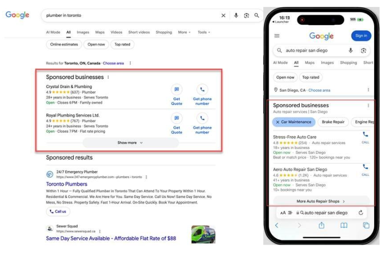 What makes LSAs distinct is their combination of placement and trust. Each eligible advertiser displays Google’s verification badge alongside ratings and reviews, helping users quickly decide which businesses feel credible enough to contact. For high-intent searches such as “emergency plumber near me” or “local house cleaner”, this positioning often captures demand before users even scroll.