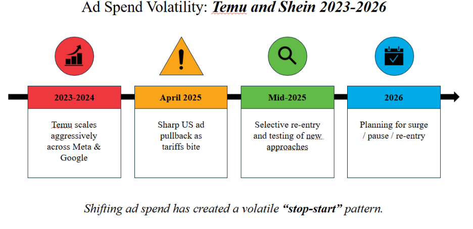 Crucially, this did not look like a permanent exit from performance channels. It suggested a willingness to increase or reduce spend based on economic conditions, creating a recurring pattern of surges, pauses, and re-entry that other advertisers now need to plan around. That interpretation is also consistent with broader reporting that Temu and Shein reduced US ad spending materially as trade pressure intensified.